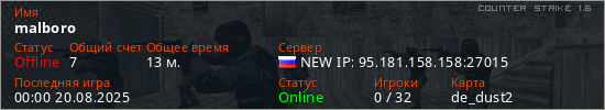 Играет на Counter Strike 1.6 сервере. Страна: РоссияПервый раз замечен 00:07 19.08.2025
