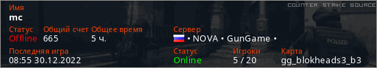 Играет на Counter Strike Source сервере. Страна: РоссияПервый раз замечен 22:13 16.08.2022