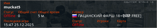 Играет на Counter Strike 1.6 сервере. Страна: РоссияПервый раз замечен 15:45 25.12.2025