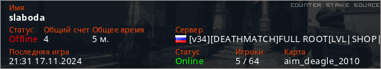 Играет на Counter Strike Source сервере. Страна: РоссияПервый раз замечен 21:29 17.11.2024