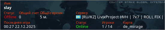Играет на Counter Strike Global Offensive сервере. Страна: КазахстанПервый раз замечен 23:27 21.12.2025