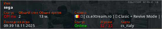 Играет на Counter Strike 1.6 сервере. Страна: РумынияПервый раз замечен 02:00 21.12.2024