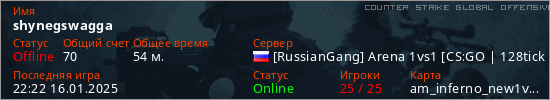 Играет на Counter Strike Global Offensive сервере. Страна: РоссияПервый раз замечен 01:17 01.01.2025