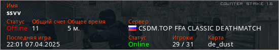 Играет на Counter Strike 1.6 сервере. Страна: РоссияПервый раз замечен 21:59 07.04.2025