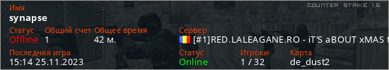 Играет на Counter Strike 1.6 сервере. Страна: РумынияПервый раз замечен 02:10 23.11.2023