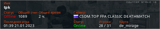 Играет на Counter Strike 1.6 сервере. Страна: РоссияПервый раз замечен 16:47 19.01.2023