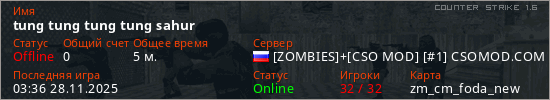 Играет на Counter Strike 1.6 сервере. Страна: РоссияПервый раз замечен 03:34 28.11.2025