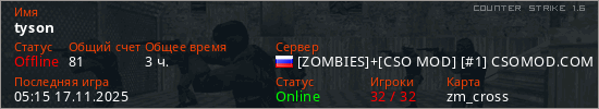 Играет на Counter Strike 1.6 сервере. Страна: РоссияПервый раз замечен 02:26 30.08.2025
