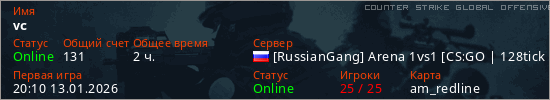 Играет на Counter Strike Global Offensive сервере. Страна: РоссияПервый раз замечен 20:10 13.01.2026