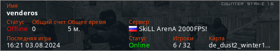 Играет на Counter Strike 1.6 сервере. Страна: РоссияПервый раз замечен 16:19 03.08.2024