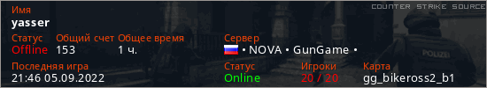 Играет на Counter Strike Source сервере. Страна: РоссияПервый раз замечен 20:34 03.09.2022