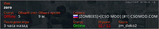 Играет на Counter Strike 1.6 сервере. Страна: РоссияПервый раз замечен 00:28 21.10.2025