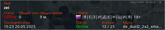 Играет на Counter Strike 1.6 сервере. Страна: РоссияПервый раз замечен 15:56 29.04.2025