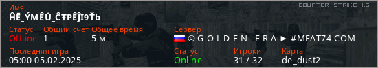 Играет на Counter Strike 1.6 сервере. Страна: РоссияПервый раз замечен 15:53 10.07.2023