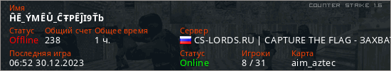 Последний раз был в сети 06:52 30.12.2023 Игрок с таким ником замечен на 15 серверах