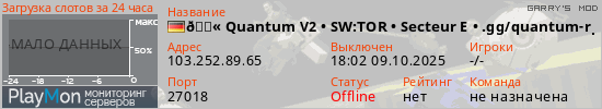 Общая информация ID: 66272 Ссылка: https://playmon.ru/server/103.252.89.65:27018 Адрес: 103.252.89.65:27018 Игроки: 0/80 Статус: Выключен Владелец: Не определён