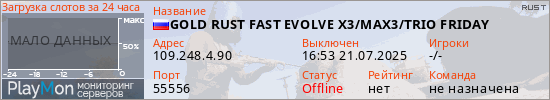 GOLD RUST FAST EVOLVE X3/MAX3/TRIO FRIDAY представлен в виде сервера раст. Из всех имеющихся на сайте модификаций игровых серверов, вам может понравиться NoDecay серверы rust. А для быстрой навигации по всем меткам - используйте главную страницу игры Rust.