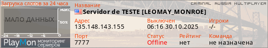 Общая информация ID: 65878 Ссылка: https://playmon.ru/server/135.148.143.155:7777 Версия: 0.3.7-R2 Адрес: 135.148.143.155:7777 Игроки: 0/50 Статус: Выключен Владелец: Не определён