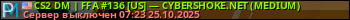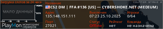 CS2 DM | FFA #136 [US] — CYBERSHOKE.NET (MEDIUM) представлен в виде сервера кс 2. Из всех имеющихся на сайте модификаций игровых серверов, наша система поставила метку DeathMatch сервера cs2. В нашем мониторинге игровых серверов вы так же можете найти где поиграть на FFA сервере кс 2.
