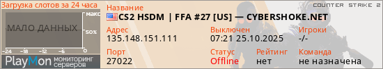 CS2 HSDM | FFA #27 [US] — CYBERSHOKE.NET представлен в виде сервера кс 2. Из всех имеющихся на сайте модификаций игровых серверов, наша система поставила метку DeathMatch сервера cs2. В нашем мониторинге игровых серверов вы так же можете найти где поиграть на FFA сервере кс 2.