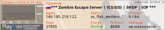 *** Zombie Escape Server | {CS:GO} | SHOP | VIP *** представлен в виде сервера кс 2. Из всех имеющихся на сайте модификаций игровых серверов, наша система поставила метку Zombie сервера cs2. В нашем мониторинге игровых серверов вы так же можете найти быструю навигацию по всем меткам - используйте главную страницу игры Counter Strike 2.