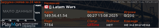 Общая информация ID: 65689 Ссылка: https://playmon.ru/server/149.56.41.54:7784 Версия: 0.3.7-R2 Адрес: 149.56.41.54:7784 Игроки: 0/200 Статус: Выключен Владелец: Не определён