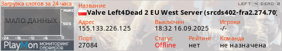 Общая информация ID: 62750 Ссылка: https://playmon.ru/server/155.133.226.125:27084 Адрес: 155.133.226.125:27084 Игроки: 0/4 Статус: Выключен Владелец: Не определён