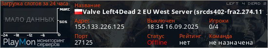 Общая информация ID: 67604 Ссылка: https://playmon.ru/server/155.133.226.125:27125 Адрес: 155.133.226.125:27125 Игроки: 0/4 Статус: Выключен Владелец: Не определён