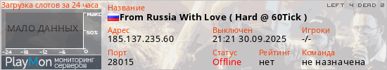 Общая информация ID: 47560 Ссылка: https://playmon.ru/server/185.137.235.60:28015 Адрес: 185.137.235.60:28015 Игроки: 0/4 Статус: Выключен Владелец: Не определён