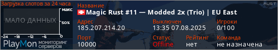Magic Rust #11 — Modded 2x (Trio) | EU East представлен в виде сервера раст. Из всех имеющихся на сайте модификаций игровых серверов, вам может понравиться NoDecay серверы rust. А для быстрой навигации по всем меткам - используйте главную страницу игры Rust.