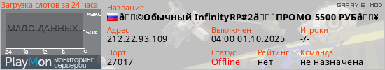 Общая информация ID: 66181 Ссылка: https://playmon.ru/server/212.22.93.109:27017 Адрес: 212.22.93.109:27017 Игроки: 0/127 Статус: Выключен Владелец: Не определён