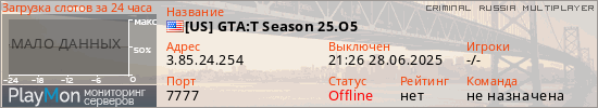Общая информация ID: 65767 Ссылка: https://playmon.ru/server/3.85.24.254:7777 Версия: 1.4.0.2783 Адрес: 3.85.24.254:7777 Игроки: 0/100 Статус: Выключен Владелец: Не определён