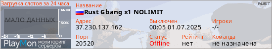Rust Gbang x1 NOLIMIT представлен в виде сервера раст. Из всех имеющихся на сайте модификаций игровых серверов, вам может понравиться PvE серверы rust. А для быстрой навигации по всем меткам - используйте главную страницу игры Rust.