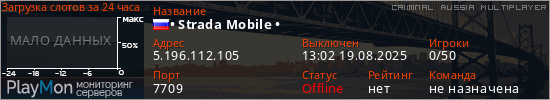 Общая информация ID: 26465 Ссылка: https://playmon.ru/server/5.196.112.105:7709 Версия: 0.3.7 Адрес: 5.196.112.105:7709 Игроки: 0/50 Статус: Выключен Владелец: Не определён