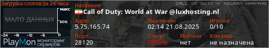 Call of Duty: World at War @luxhosting.nl представлен в виде сервера код 4. Из всех имеющихся на сайте модификаций игровых серверов, вам может понравиться HardCore серверы cod4. А для быстрой навигации по всем меткам - используйте главную страницу игры Call of Duty 4: Modern Warfare.