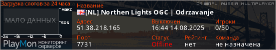 Общая информация ID: 65859 Ссылка: https://playmon.ru/server/51.38.218.165:7731 Версия: 0.3.7-R2 Адрес: 51.38.218.165:7731 Игроки: 0/50 Статус: Выключен Владелец: Не определён