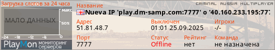 Общая информация ID: 65377 Ссылка: https://playmon.ru/server/51.81.48.7:7777 Версия: 1.4.0.2783 Адрес: 51.81.48.7:7777 Игроки: 0/50 Статус: Выключен Владелец: Не определён