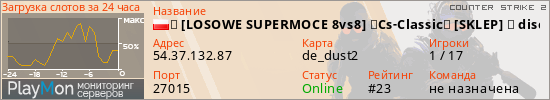 ★ [LOSOWE SUPERMOCE 8vs8] ★Cs-Classic★ [SKLEP] ★ discor представлен в виде сервера кс 2. Из всех имеющихся на сайте модификаций игровых серверов, наша система поставила метку Classic сервера cs2. В нашем мониторинге игровых серверов вы так же можете найти быструю навигацию по всем меткам - используйте главную страницу игры Counter Strike 2.