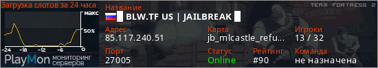 █ BLW.TF US | JAILBREAK █ представлен в виде сервера тф2. Из всех имеющихся на сайте модификаций игровых серверов, наша система поставила метку JailBreak сервера tf2. В нашем мониторинге игровых серверов вы так же можете найти быструю навигацию по всем меткам - используйте главную страницу игры Team Fortress 2.