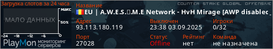 EU | A.W.E.S.〄.M.E Network - HvH Mirage [AWP disabled] представлен в виде сервера кс го. Из всех имеющихся на сайте модификаций игровых серверов, наша система поставила метку AWP сервера csgo. В нашем мониторинге игровых серверов вы так же можете найти где поиграть на Hacks vs Hacks сервере кс го.