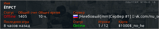 Играет на Counter Strike 1.6 сервере. Страна: РоссияПервый раз замечен 21:38 20.11.2025