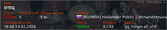 Играет на Team Fortress 2 сервере. Страна: РоссияПервый раз замечен 18:46 14.02.2026