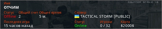 Играет на Counter Strike 1.6 сервере. Страна: УкраинаПервый раз замечен 18:29 16.02.2026