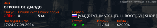 Играет на Counter Strike Source сервере. Страна: РоссияПервый раз замечен 17:22 07.09.2024