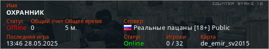 Играет на Counter Strike 1.6 сервере. Страна: РоссияПервый раз замечен 13:42 28.05.2025