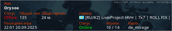 Играет на Counter Strike Global Offensive сервере. Страна: КазахстанПервый раз замечен 00:12 20.09.2025