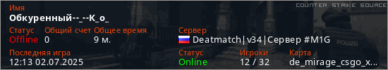 Играет на Counter Strike Source сервере. Страна: РоссияПервый раз замечен 11:21 02.07.2025