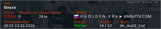 Играет на Counter Strike 1.6 сервере. Страна: РоссияПервый раз замечен 23:49 21.02.2026
