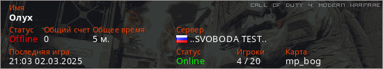Играет на Call of Duty 4: Modern Warfare сервере. Страна: РоссияПервый раз замечен 19:55 02.03.2025