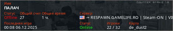 Играет на Counter Strike 1.6 сервере. Страна: СШАПервый раз замечен 21:57 16.11.2025